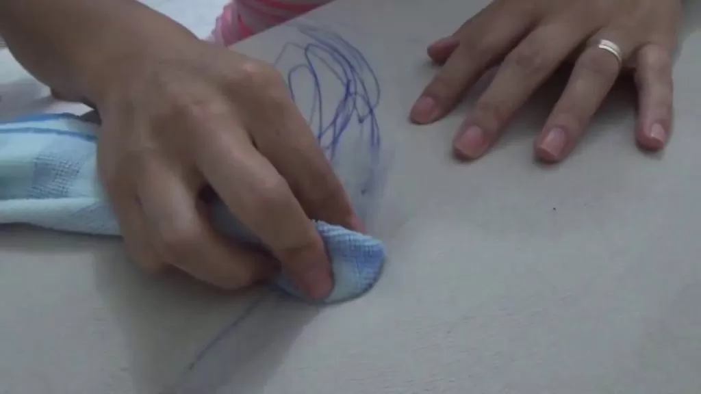 Utilizando um pano que é umedecido na mistura, aplicamos no risco da caneta. Movimente o pano delicadamente, sem apertar ou esfregar.